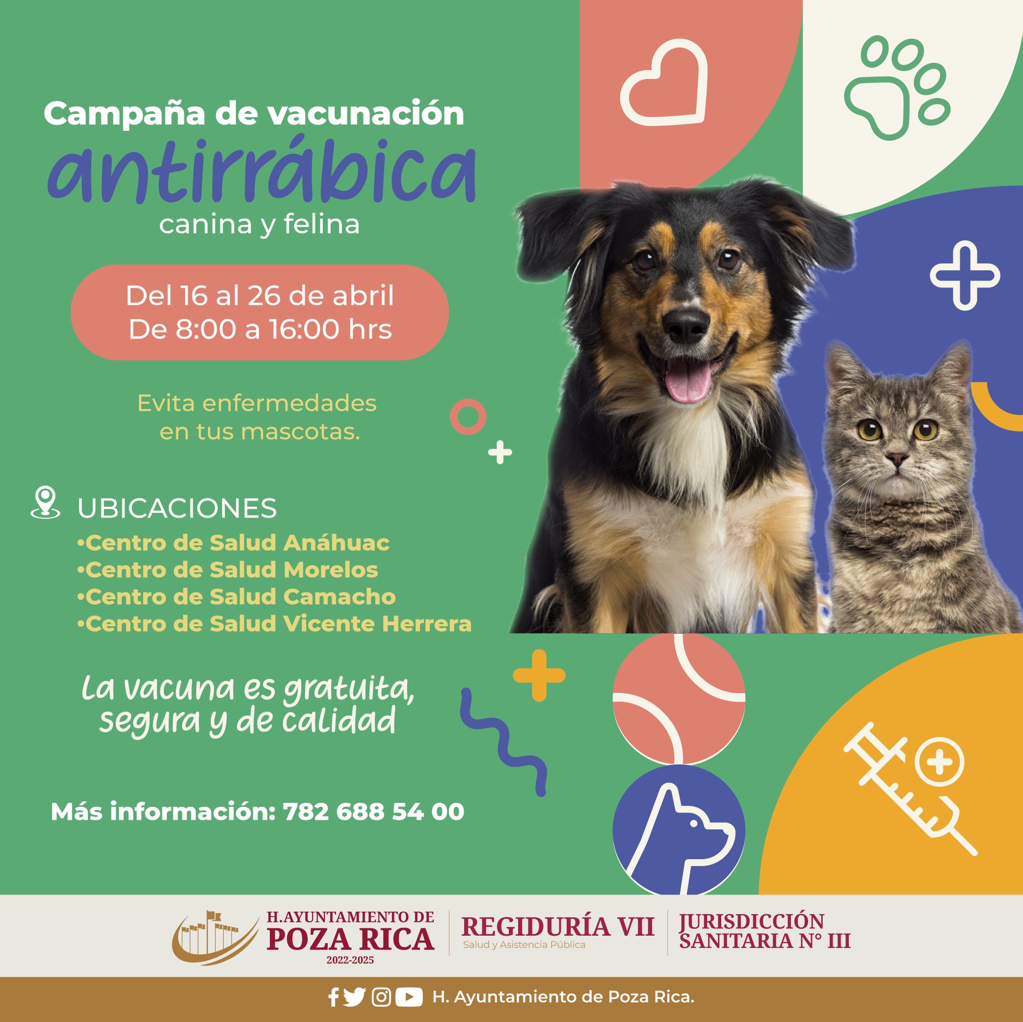 Protege a tus mascotas vacunándolas contra la rabia del 16 al 26 de abril en tu Centro de Salud más cercano.