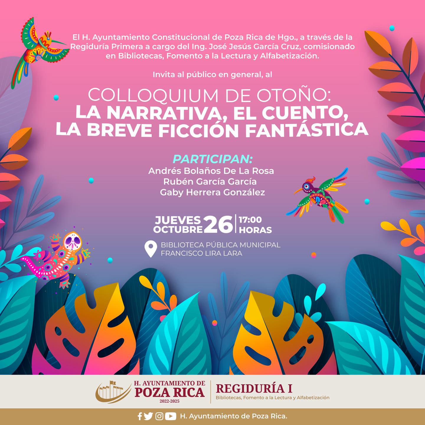 Poza Rica, Veracruz, a 25 de octubre de 2023. El próximo 29 de octubre se llevará a cabo el Colloquium de Otoño, un evento literario que reunirá a escritores, académicos y críticos de la narrativa, el cuento y la breve ficción fantástica de Poza Rica y la región.