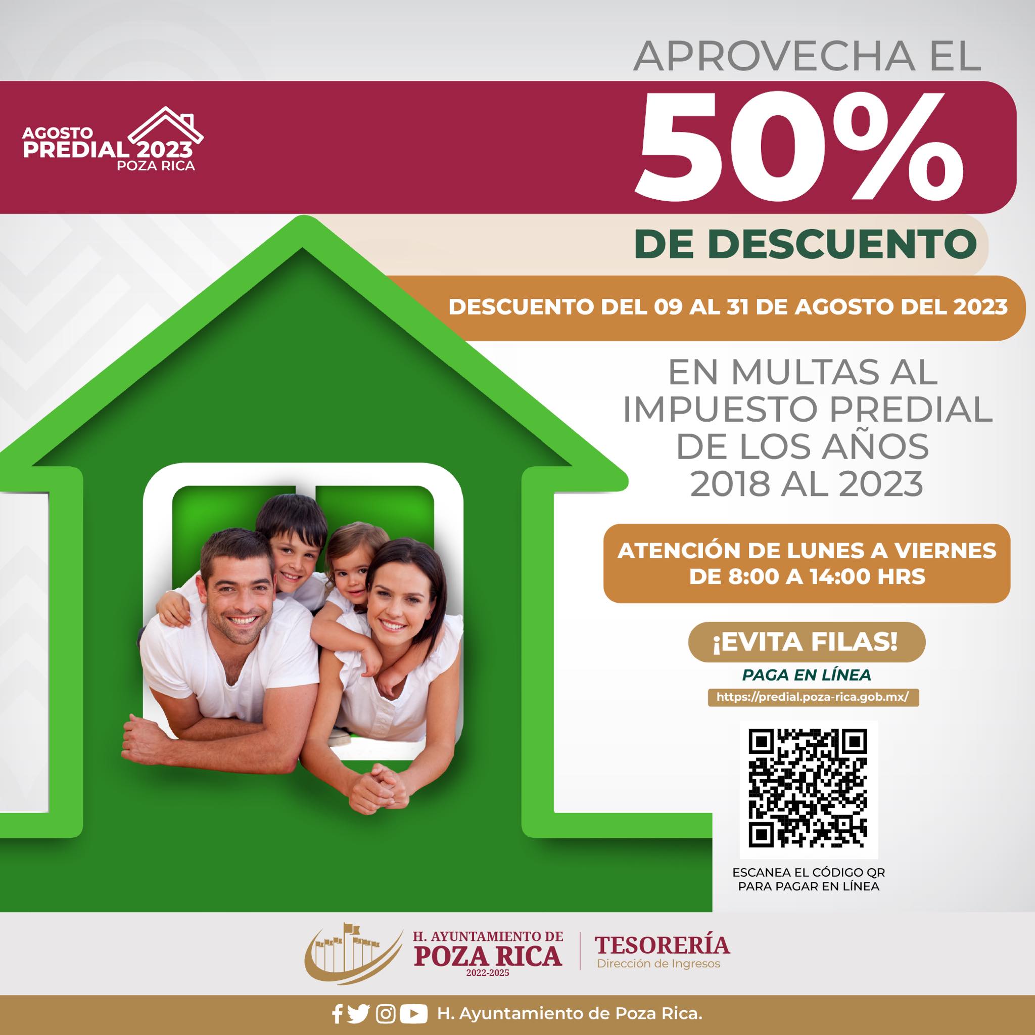 Para incentivar esta participación ciudadana y reconocer la importancia de cada contribución, hemos implementado un atractivo descuento del 50% en el pago de predial. Este descuento estará disponible durante un período específico: del 09 al 31 de agosto del 2023. Es la ocasión ideal para cumplir con tus obligaciones fiscales y al mismo tiempo beneficiarte de este ahorro significativo.