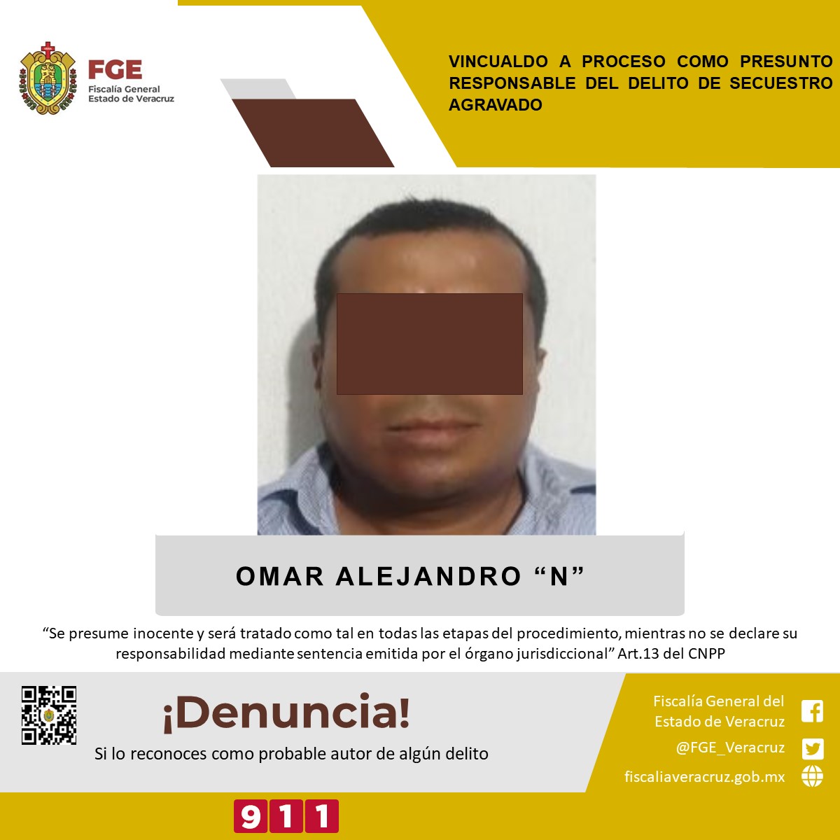 Poza Rica, Ver; a 14 agosto del 2023.- La Unidad Especializada en Combate al Secuestro obtuvo vinculación a proceso en contra de Omar Alejandro “N” como presunto responsable del delito de secuestro agravado cometido en agravio de la víctima C.G.P.S.