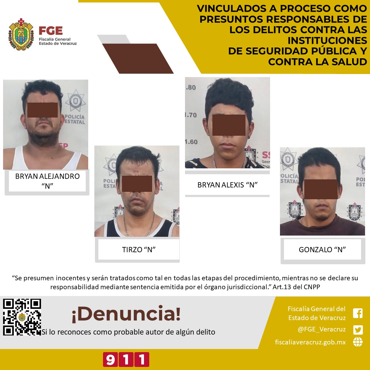 Poza Rica, Ver., 12 de Enero del 2023.- La Fiscalía Regional Tuxpan obtuvo vinculación a proceso en contra de Gonzalo “N”, Bryan Alejandro “N”, Tirzo “N” y Bryan Alexis “N” como presuntos responsables de los delitos contra las instituciones de seguridad pública y contra la salud.