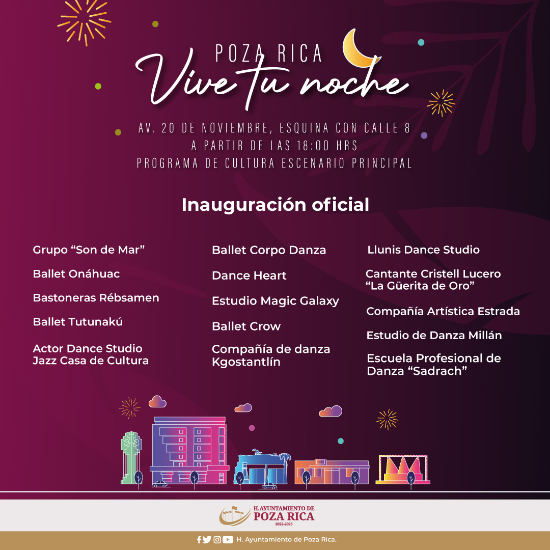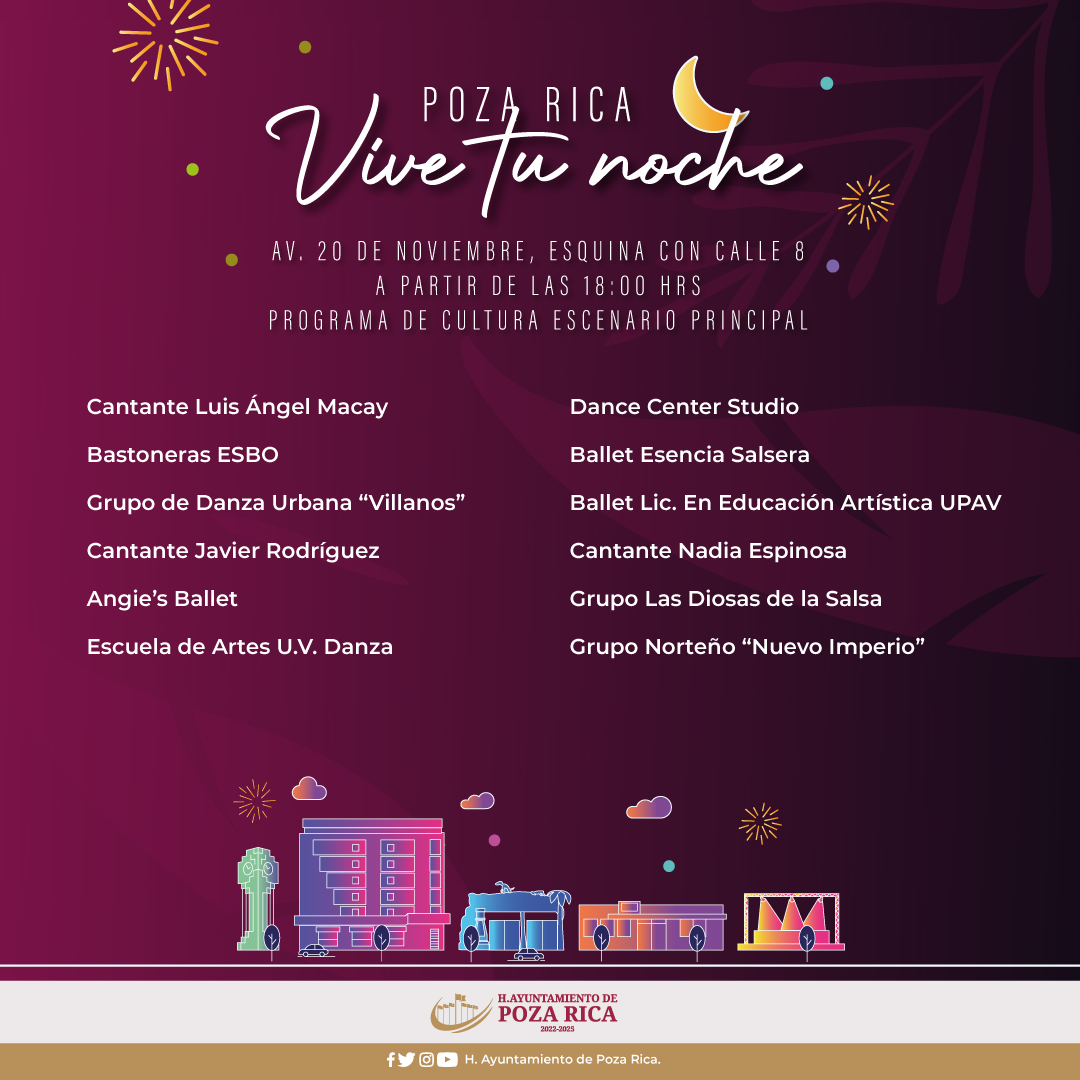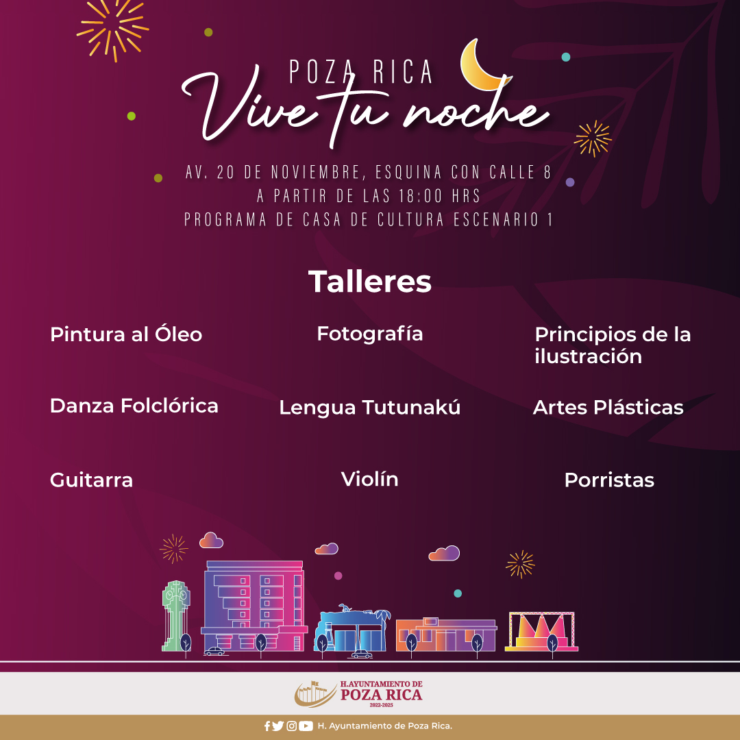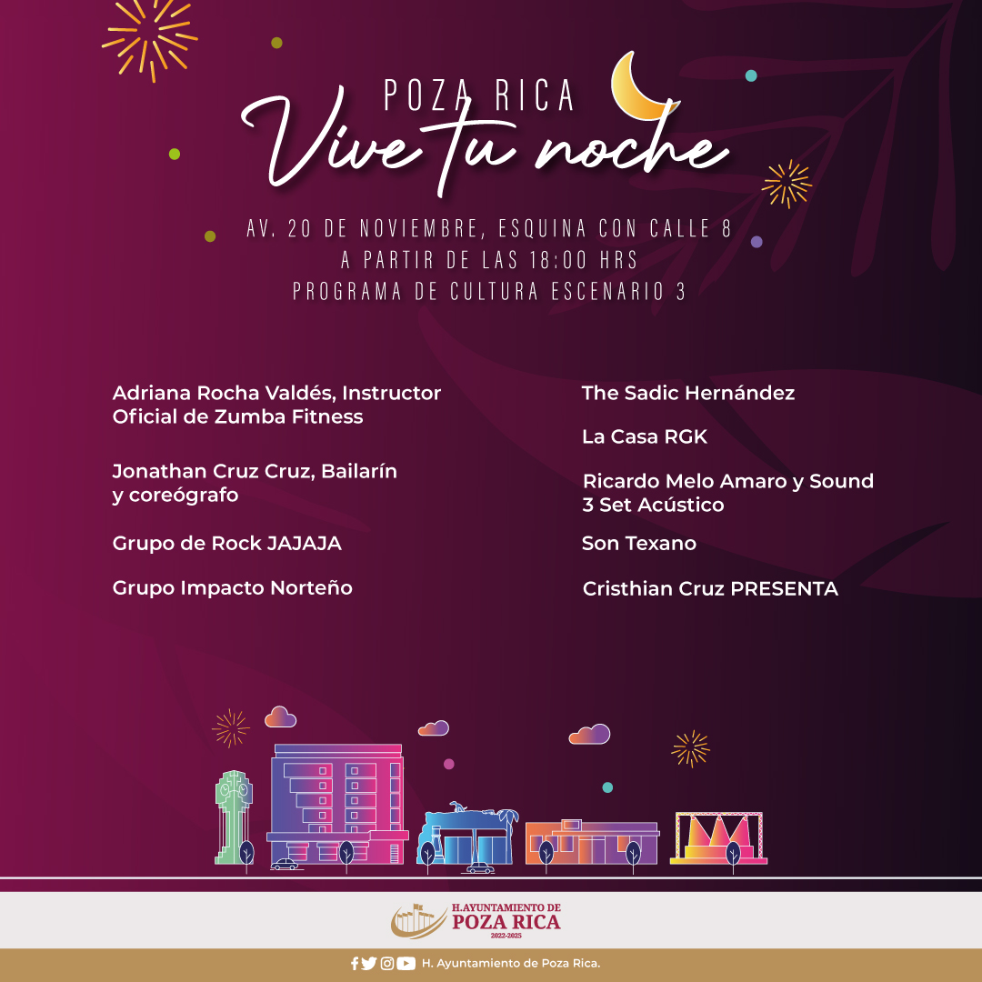 ¡Poza Rica, Vive tu noche! Con 3 escenarios distintos donde habrá talleres, presentaciones de baile, música y mucha diversión. ¡Asiste en familia, en tu bici, con tu mascota!